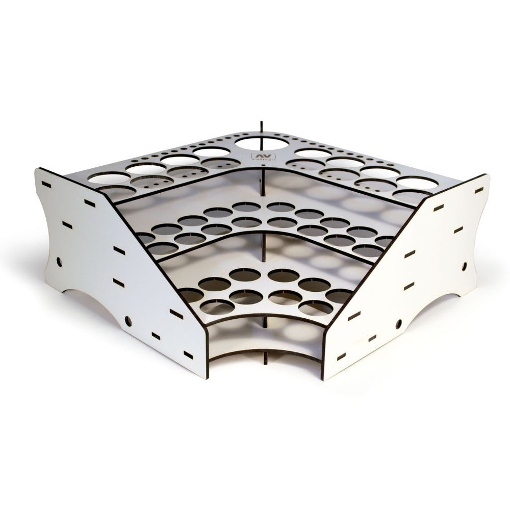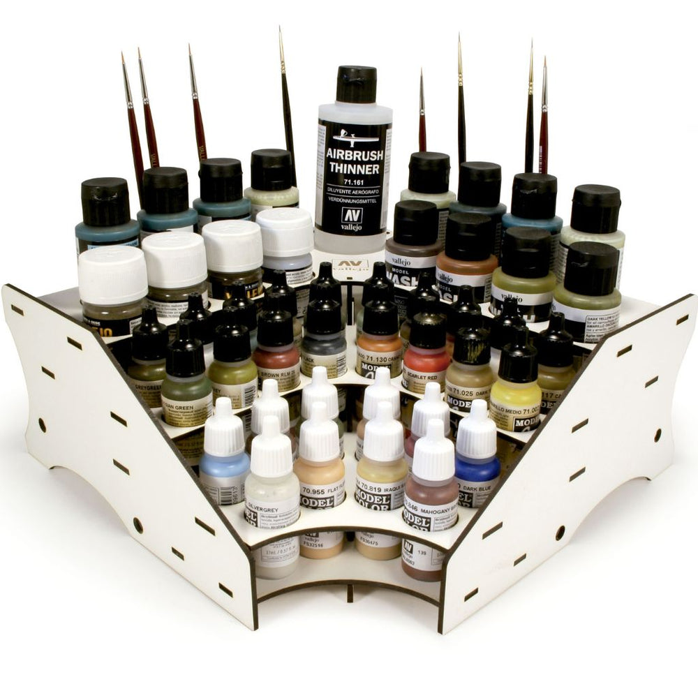 - Vallejo corner module paint stand that contains 28 paint bottle spaces of 17 ml per each, 16 of 35 ml or 60 ml, 1 of 200 ml and 26 for brushes.