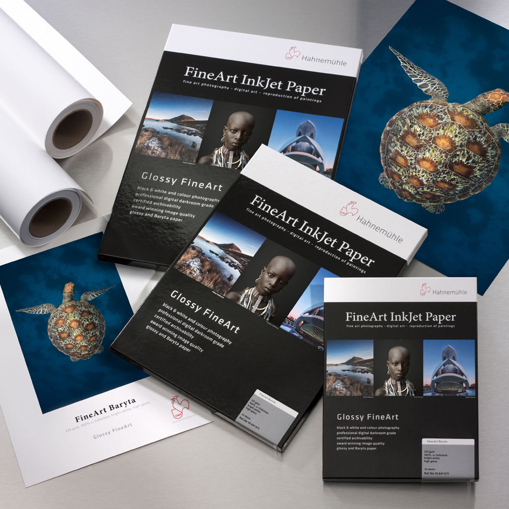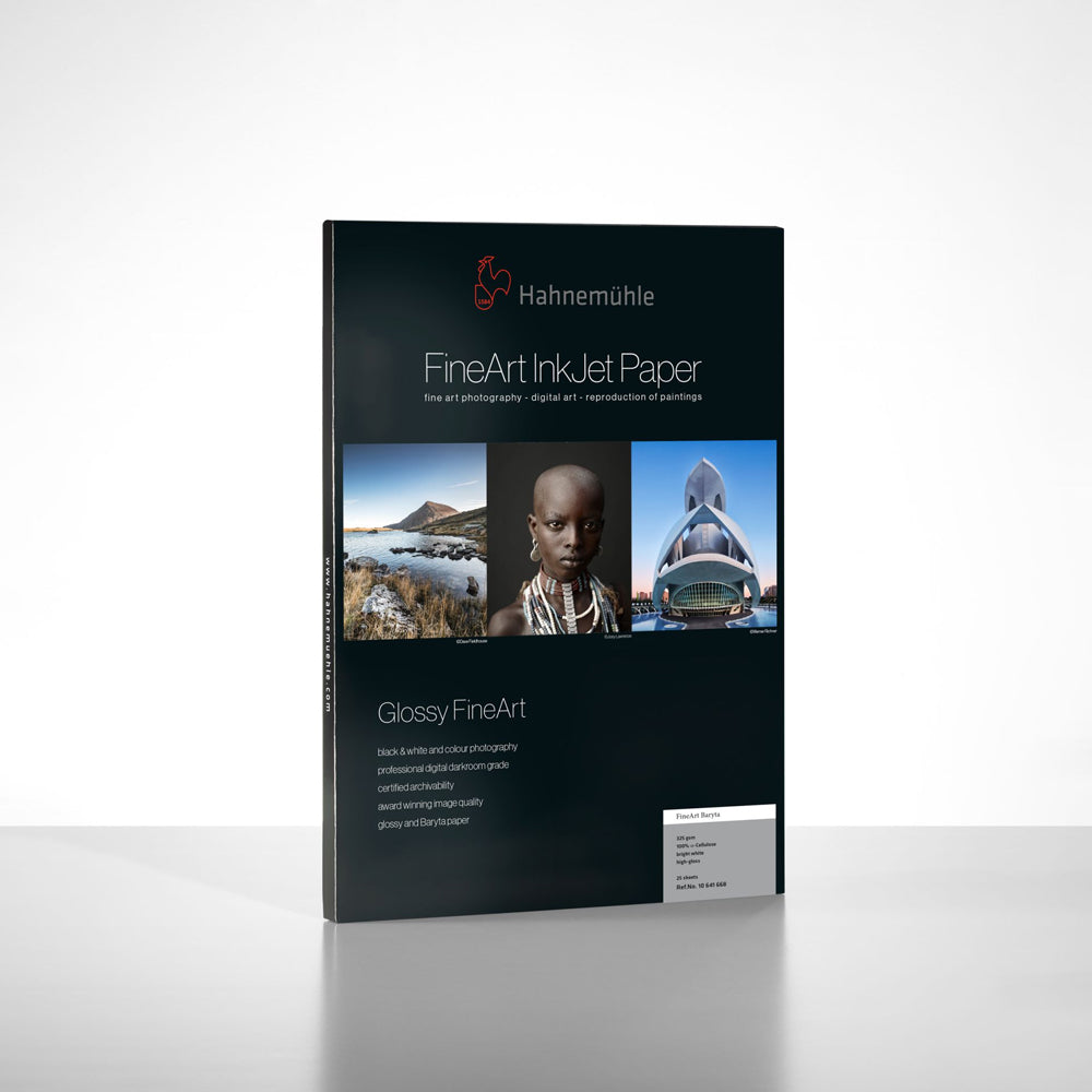 - Hahnemühle FineArt Baryta yra ryškiai baltas celiuliozės pagrindu pagamintas dailės popierius, padengtas specialiai FineArt naudojimui pritaikyta danga;