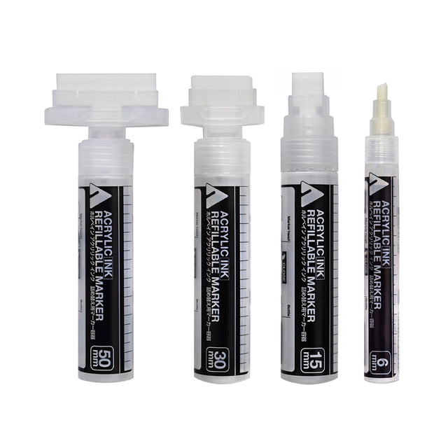 • Idealiai tinkantys naudoti su Holbein akriliniu tušu, žymekliai yra keturių dydžių – 6 mm, 15 mm, 30 mm ir 50 mm;