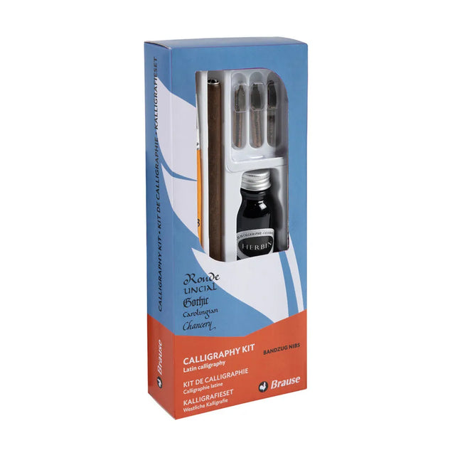 - This box contains 3 Bandzug calligraphy nibs (1.5/2.5/3 mm), 1 wooden nib holder, 1 size 8 brush to fill the reservoirs of the Bandzug nibs, 1 bottle of Jacques Herbin black calligraphy ink (15 ml) and 1 instruction leaflet.